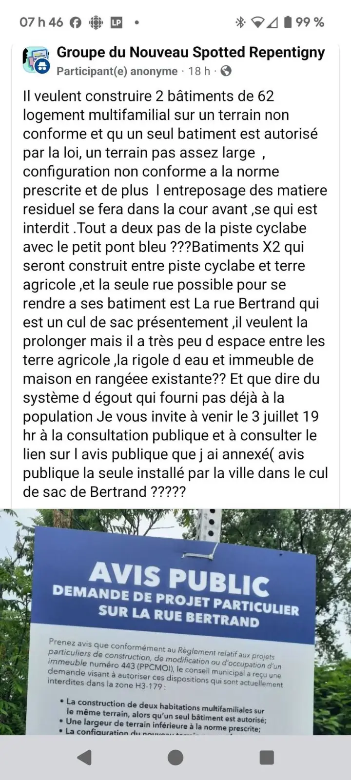 Afin d'autoriser la construction d'un projet immobilier (logements style condo) l'administration en place change les règles du jeux. Que pensez-vous de cette consultation publique qui aura lieu le 3 juillet 2025 (mini affiche installée le 25 juin 2025 sur la rue Bertrand) ?
