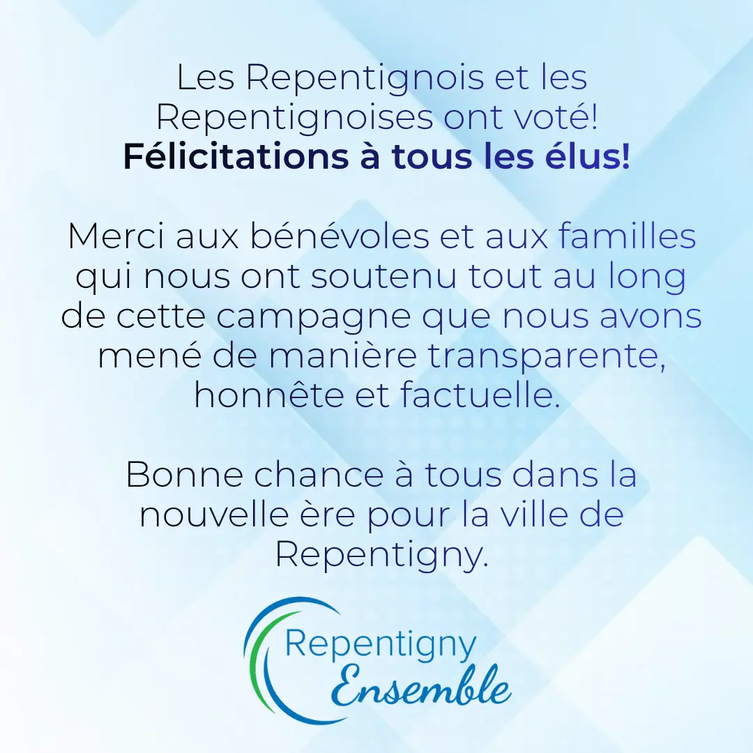 Pour Repentigny Ensemble le verdict n'est pas comme nous l'avons voulu, pas comme nous l'avons planifié, mais nous le recevons avec la tête haute!