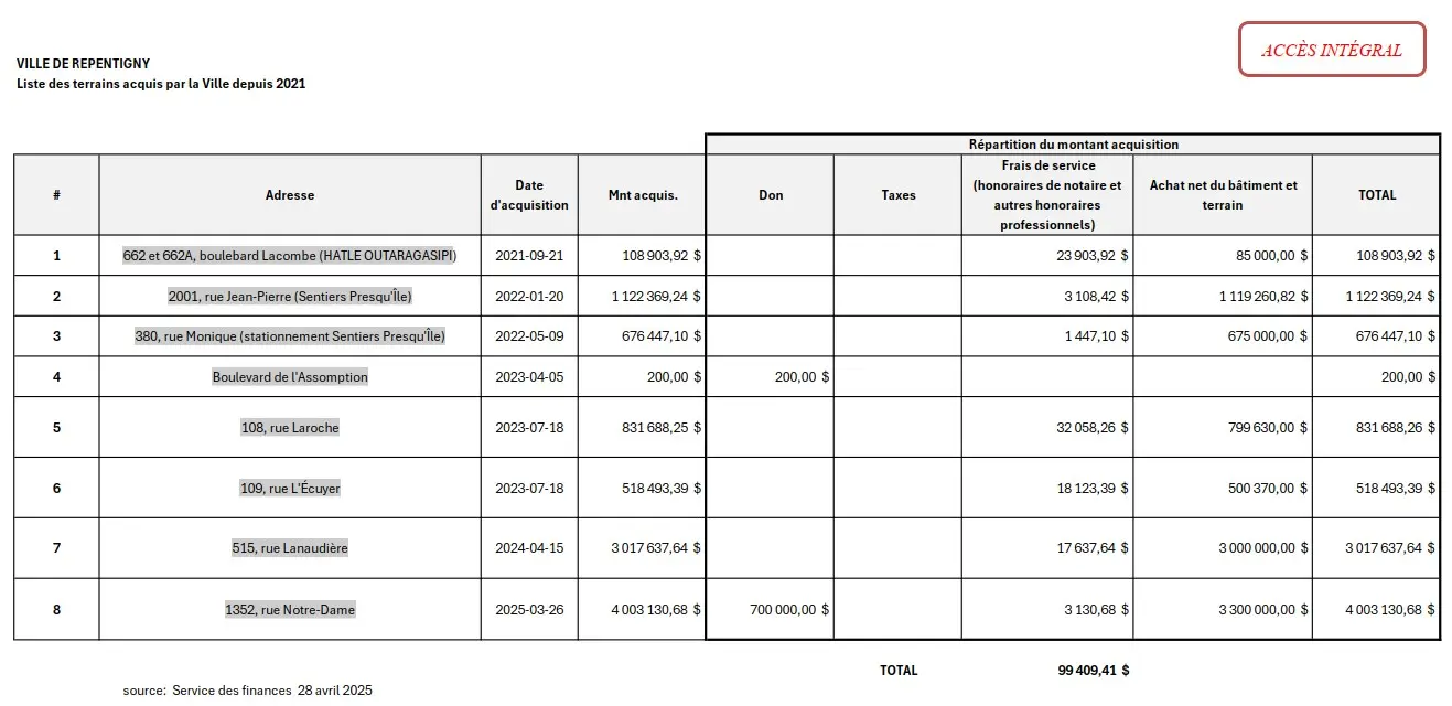 - Achats des terrains/propriétés locatifs et d’espaces commerciaux en valeur de dizaines de millions $, plus que la valeur foncière établie, sans évaluateurs externes payés par la ville, mais plutôt par les vendeurs et, le tout, sans appel d’offre