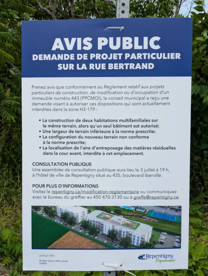 Afin d'autoriser la construction d'un projet immobilier (logements style condo) l'administration en place change les règles du jeux. Que pensez-vous de cette consultation publique qui aura lieu le 3 juillet 2025 (mini affiche installée le 25 juin 2025 sur la rue Bertrand) ?